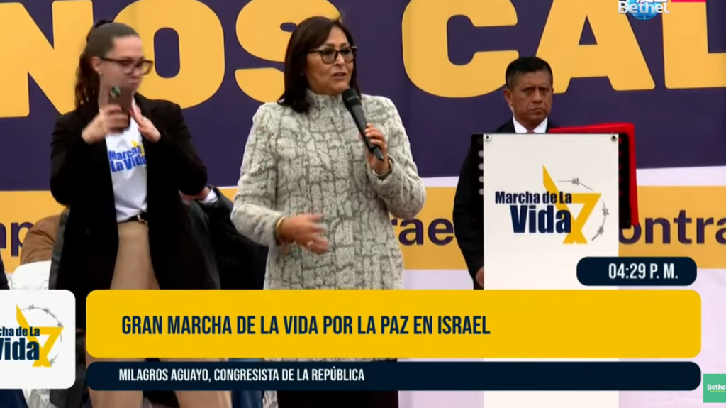 Ya en el evento del Campo de Marte se hicieron presentes algunos parlamentarios. Una de ellos fue la legisladora Milagros Jáuregui de Aguayo, quien señaló que también es vicepresidenta de la Liga de Amistad Perú – Israel.