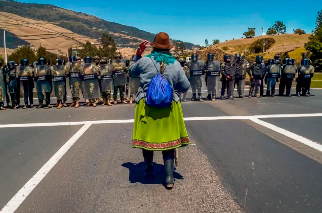 Una mujer indígena, con falda, botas de caucho levanta su mano frente a un pelotón de al menos treinta militares armados y protegidos con escudos, cascos y máscaras, en una carretera en Imbabura. Un joven con la bandera de Ecuador baila sobre el techo de una parada de transporte público, en Quito, mientras otros y otras cantan. Una movilización de más de 100 mil personas recorre las calles de Cuenca, como un río: “el quinto río”, lo llamaron, en defensa del agua y en contra de la minería en Kimsacocha, una reserva de agua de la tercera ciudad más grande del país. Indígenas y campesinos con poncho rojo caminan en Latacunga para decir que “si sube el diésel sube todo” y que el trabajo de las manos del campo no van a “subsidiar a los de arriba”. En la Amazonía, mujeres indígenas levantan su palabra y le dicen al gobierno que la selva no está en venta.